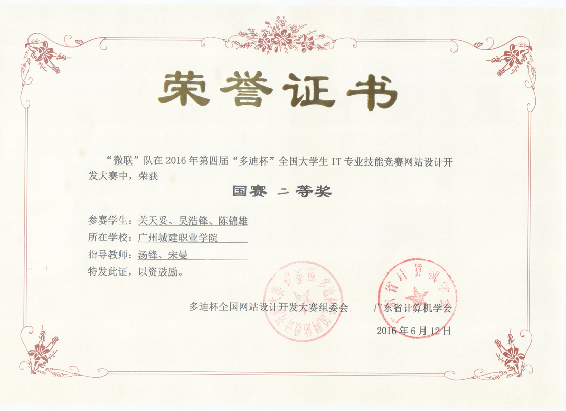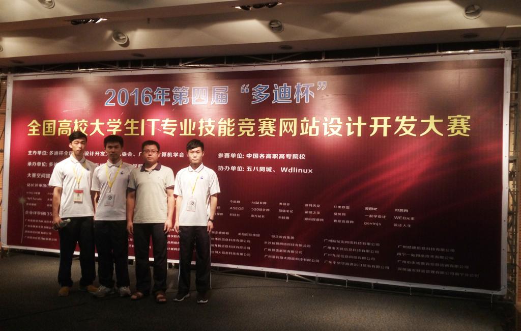 6月12日,由广东省计算机学会主办的第四届“多迪杯”全国网站设计开发大赛现场总决赛在广东岭南职业技术学院落下帷幕,由汤锋、宋曼老师指导,关天妥、吴浩锋和陈锦雄同学创作的作品《一起换》最终闯入决赛获得二等奖。