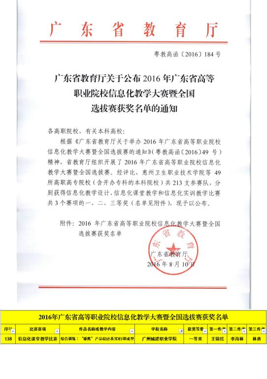 近日,从广东省教育厅传来喜讯,经过全省50多所高校的127个决赛项目的激烈角逐,机信学院王锦红院长获“2016年广东省高等职业院校信息化教学大赛暨全国选拔赛信息化课堂教学比赛”一等奖。