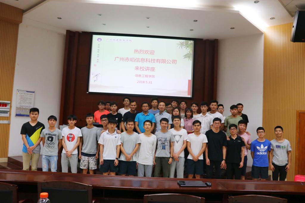5月31日下午,软件技术专业特邀广州赤焰科技信息有限公司CEO彭逢春在建工机电楼A101报告厅开展主题为“十年IT成长路”的就业创业讲座。公司总经理袁书妮、技术骨干张晋铭,信息工程学院副院长汤锋、软件技术教研室全体教师及150余名学生代表参加了讲座,讲座由教研室主任卢鹏主持。