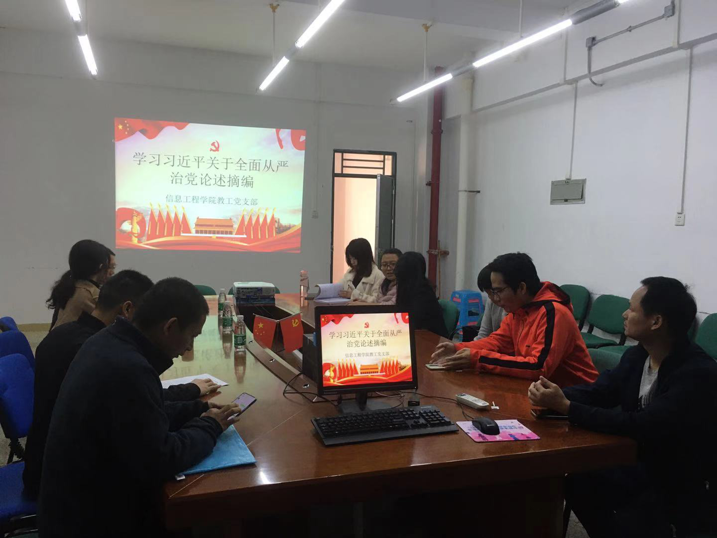 为进一步增强党员党性观念,勇当先锋模范。11月30日下午,信息工程学院教工党支部在2328会议室开展“学习习近平关于全面从严治党论述摘编”的主题党日活动。活动由教工党支部副书记熊婉迪主持。