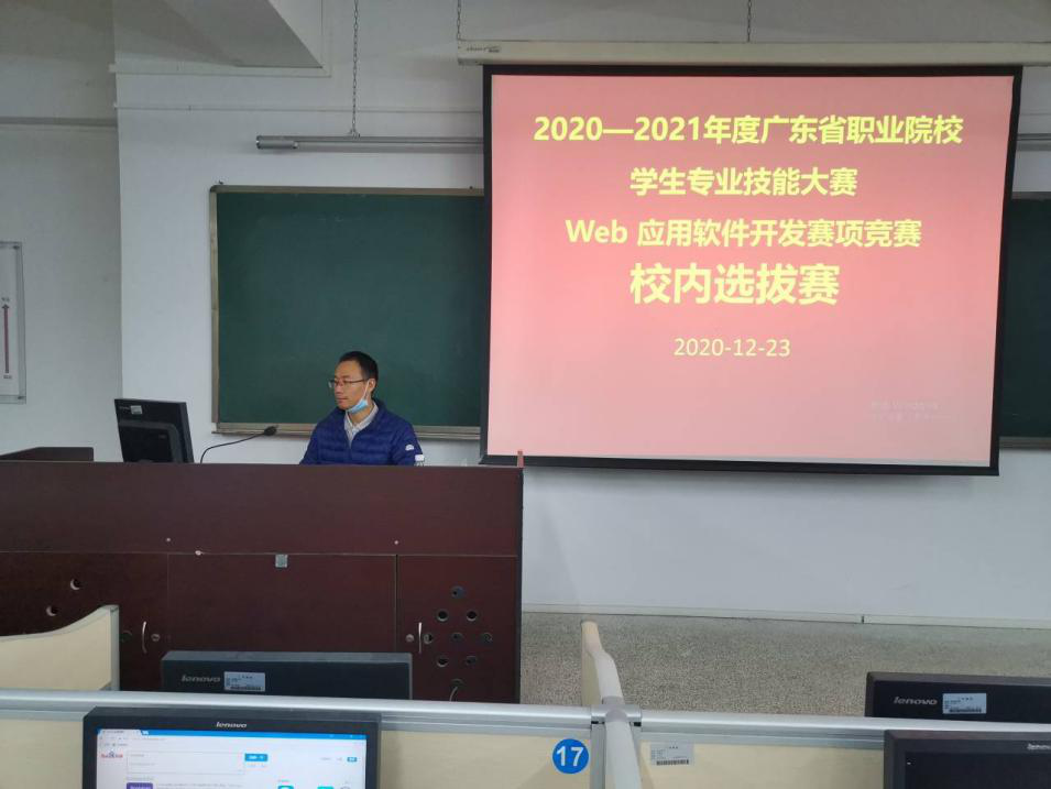 12月23日,2020-2021年度广东省职业院校技能大赛学生专业技能竞赛“Web应用软件开发”赛项校内选拔赛在2408教室举行。软件技术专业张宇、朱志亭老师担任本次web应用软件项目校内选拔赛老师,来自软件技术、计算机应用技术、大数据技术与应用等三个专业近50名学生参加了本次选拔赛。