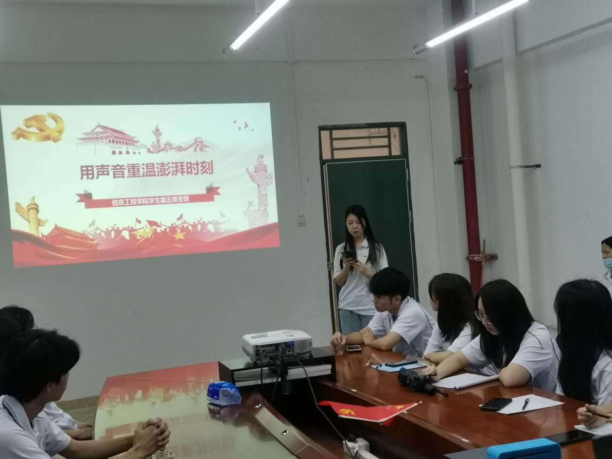 7月5日,信息工程学院学生第五党支部在信工财经楼328召开主题为“重温澎湃时刻”的学习分享会。本次会议由支部书记苏碧玲主持,全体学生党员参与。