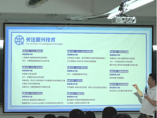 余总监还分享了诸如深信服的AIGC安全运营、360的大规模数据风险安全分级系统等典型方案。这些内容不仅展示了企业在技术前沿的探索,也为学生们提供了丰富的知识储备,为他们未来从事网络安全相关工作打下了坚实基础。