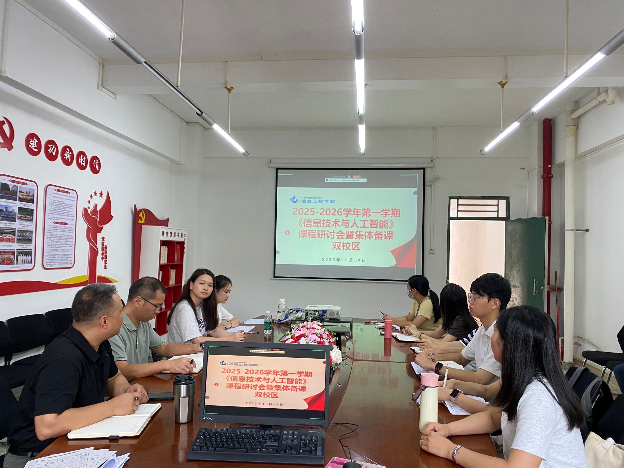 10月9日下午15:30,《信息技术与人工智能》课程研讨会暨集体备课会在信工财经楼328会议室与腾讯会议平台同步举行。本次会议是学校广州、清远双校区启动4.0改革后的重要教学研讨活动,采用“线下主会场+线上分会场”模式,广州校区教师现场参会,清远校区教师云端联动,学院院长曹春华、副院长刘君,未来技术应用学院副院长郑永芹及全体任课教师共同参会。