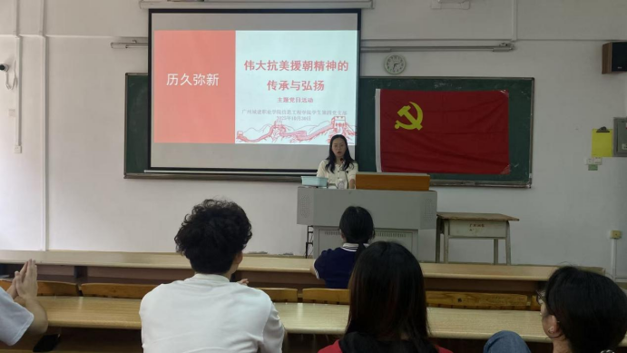 会上,支部书记林赛赛以《历久弥新:伟大抗美援朝精神的传承与弘扬》为题讲授主题党课,通过历史时间线与战役案例,阐述了抗美援朝的光辉历程和伟大胜利,深入学习伟大抗美援朝精神的丰富内涵、时代价值,并探讨传承路径。