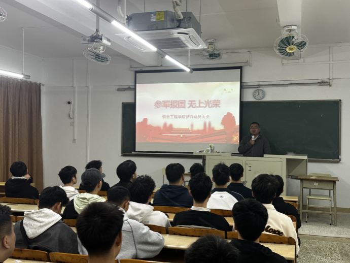 为深入普及2026年度国家春季征兵政策,鼓励有志青年大学生积极参军入伍,11月20日,我院在信工财经楼326课室召开了以“保家卫国终不悔,投身军旅献青春”为主题的征兵动员大会。学工副院长刘杰及学院有参军意向的学生参加会议,会议由学院征兵专员陈俊均主持。