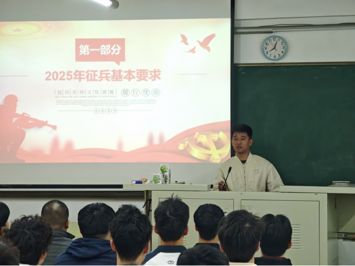 会议最后,刘杰作总结发言,向同学们寄予三点殷切期望:一是期望大家立足个人学业发展与职业规划的长远视角,精准把握入伍的最佳时机,让青春在军营绽放光彩;二是期望同学们在校期间严守校规校纪,以自律自强的姿态为投身军旅筑牢坚实根基;三是期望同学们始终秉持端正纯粹的态度,无论最初怀揣何种入伍初心,最终都要将拳拳之心化作实际行动,坚定不移地践行全心全意为人民服务的崇高信念。