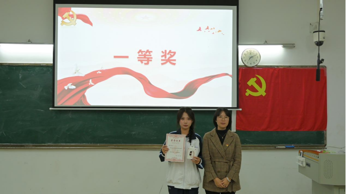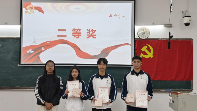 在热烈掌声中,苏碧玲、李思丽、王宇翔依次为荣获一、二、三等奖及优秀奖的同学颁发荣誉证书和奖品。