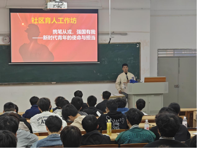 为深化大学生国防教育与责任意识培育,12月2日,我院社区育人工作坊以“携笔从戎,强国有我——新时代青年的使命与担当”为主题,在2117教室开展专题宣讲活动,学院学工办陈俊均老师主讲,百余名学生到场参与,现场氛围热烈。