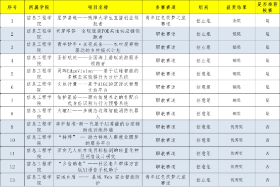 院属各部门:根据学校《关于举办广州城建职业学院关于举办中国国际大学生创新大赛(2026)校内选拔赛的通知》文件要求,我院组织开展了信息工程学院院内选拔赛。经学院初步评审,共有13项优秀作品脱颖而出,入围最终角逐。通过团队路演、现场答辩和评委评审,最终评出金奖1项、银奖2项、铜奖5项、优秀奖5项,共计8个项目推荐校赛,现将比赛结果公示如下: